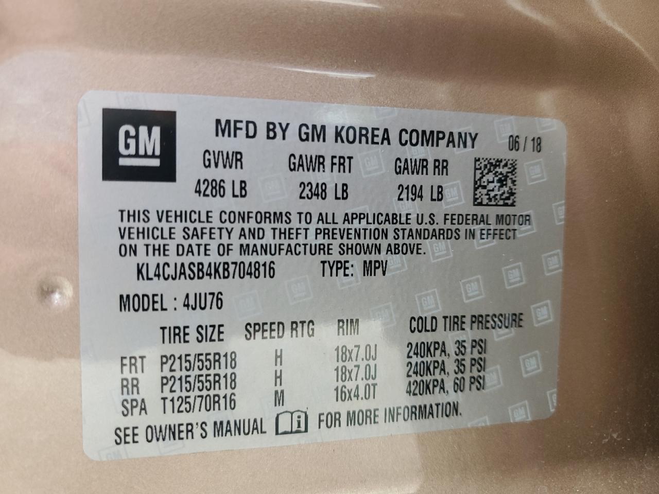 Цвет ЗагарЦилиндры 4VIN KL4CJASB4KB704816Состояние НеизвестноПовреждение Передняя или задняя