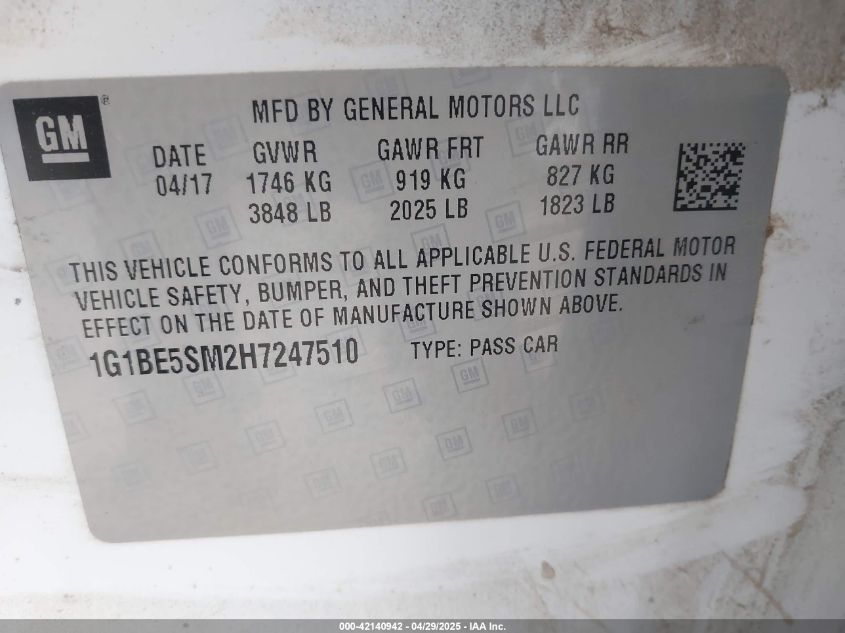 Цвет БелыйЦилиндры 4Привод Передний приводVIN 1G1BE5SM2H7247510Состояние СтационарноПовреждение Левая сторона