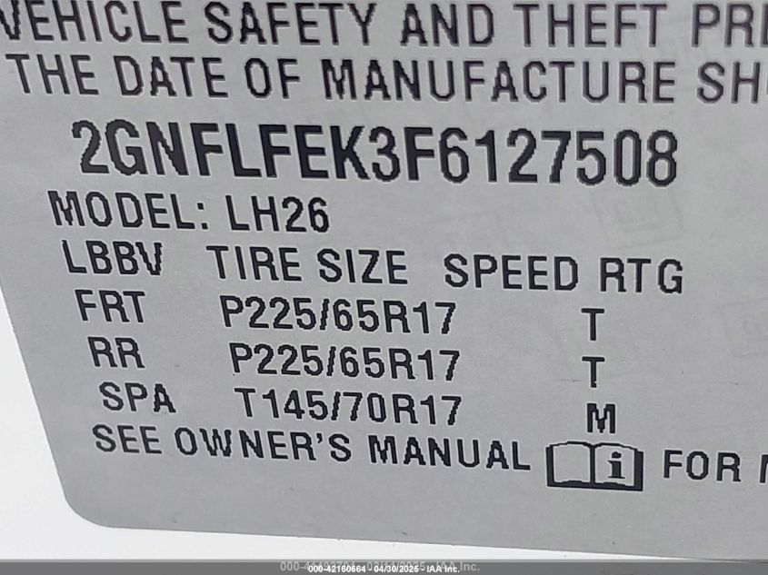 Цвет БелыйЦилиндры 4Привод Полный приводVIN 2GNFLFEK3F6127508Состояние Заводится и едет (проверено)Повреждение Передняя или задняяДата аукциона 2025-11-14