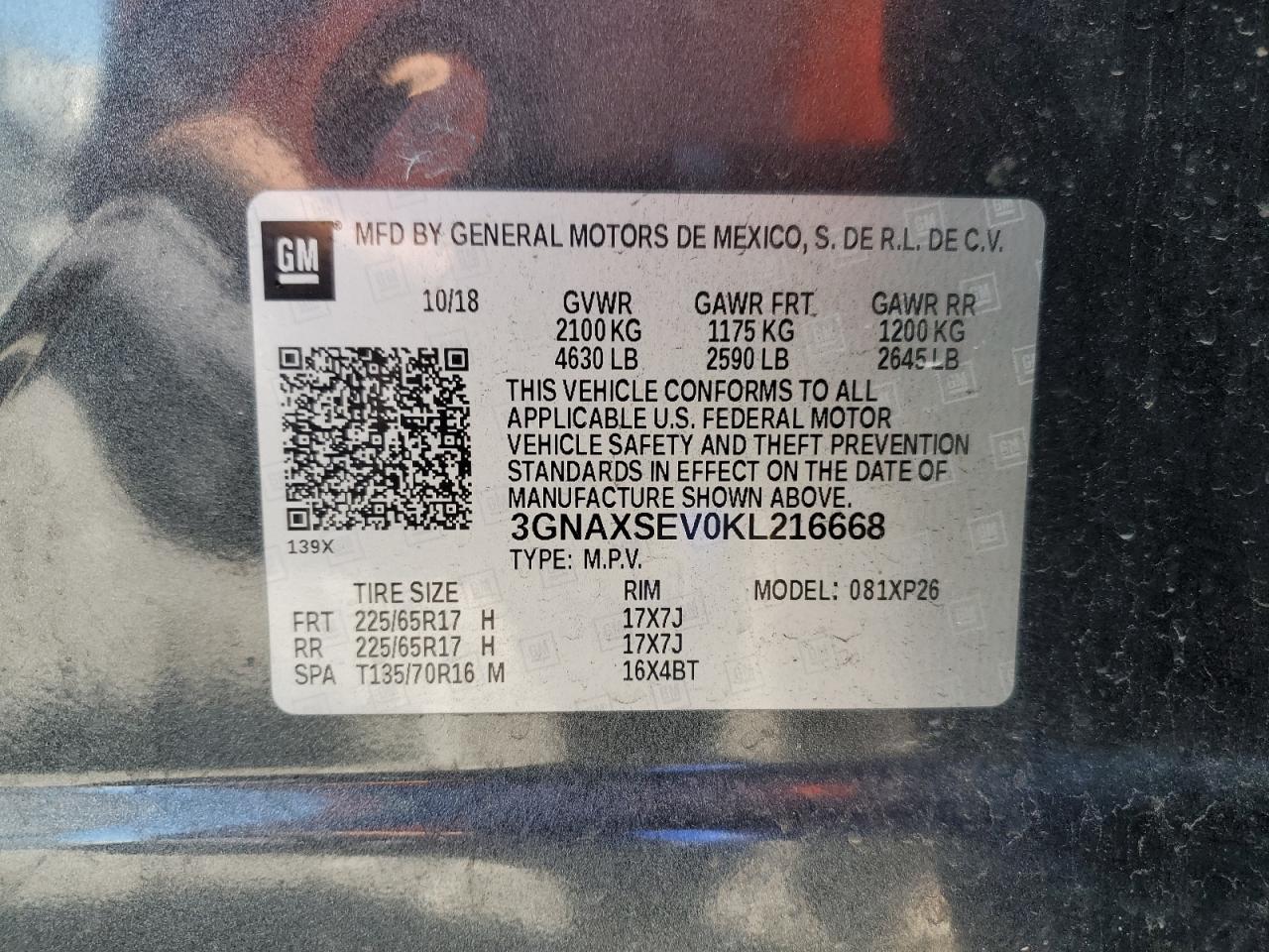 Цвет СерыйЦилиндры 4Привод Полный приводVIN 3GNAXSEV0KL216668Состояние Заводится и едет (проверено)Повреждение Передняя или задняя