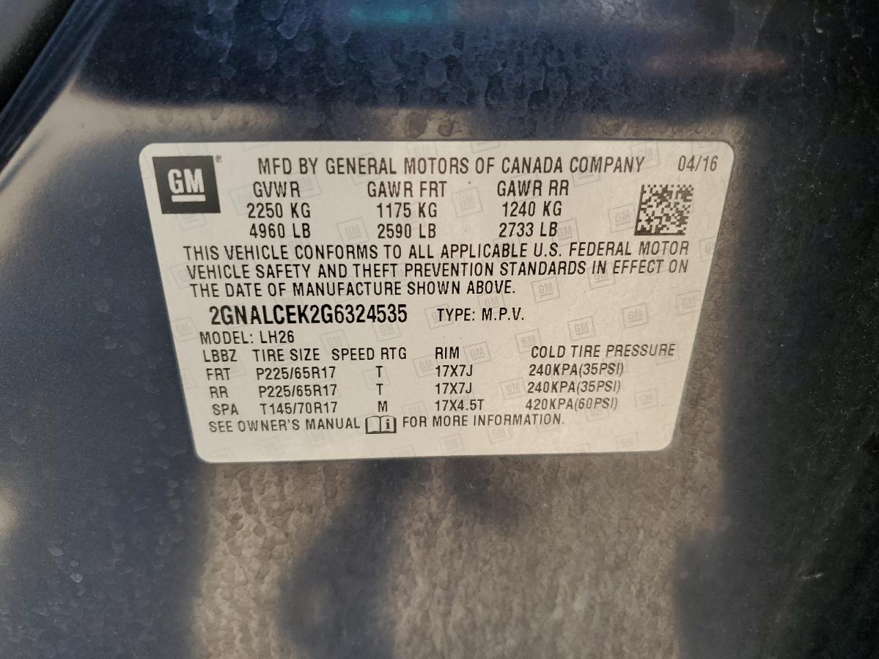 CHEVROLET EQUINOX 2.4 2016 г.в., (2GNALCEK2G6324535) из США