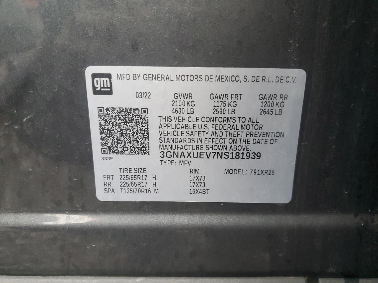CHEVROLET EQUINOX 1.5 2022 г.в., Полный привод (3GNAXUEV7NS181939) из США