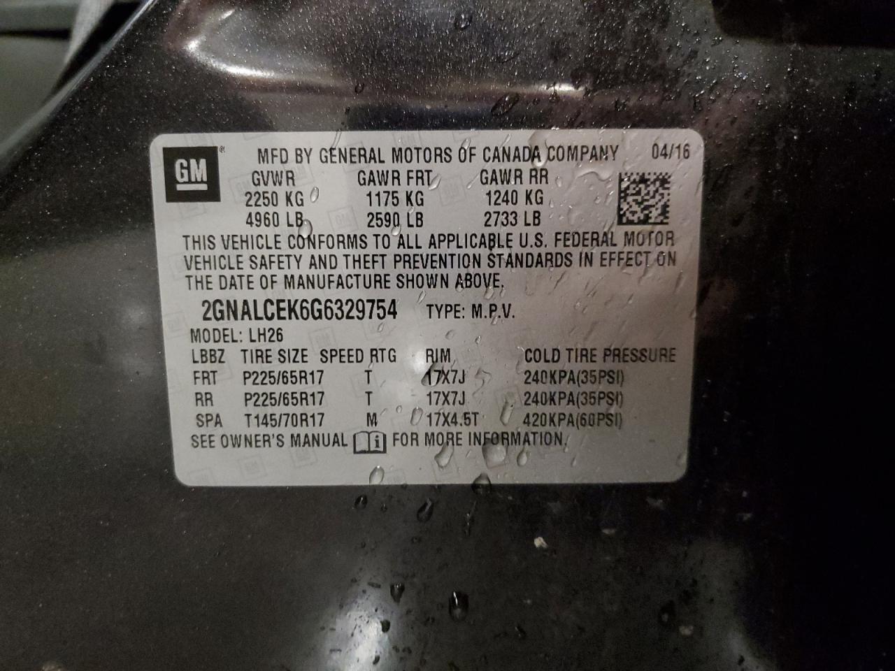 CHEVROLET EQUINOX 2.4 2016 г.в., (2GNALCEK6G6329754) из США