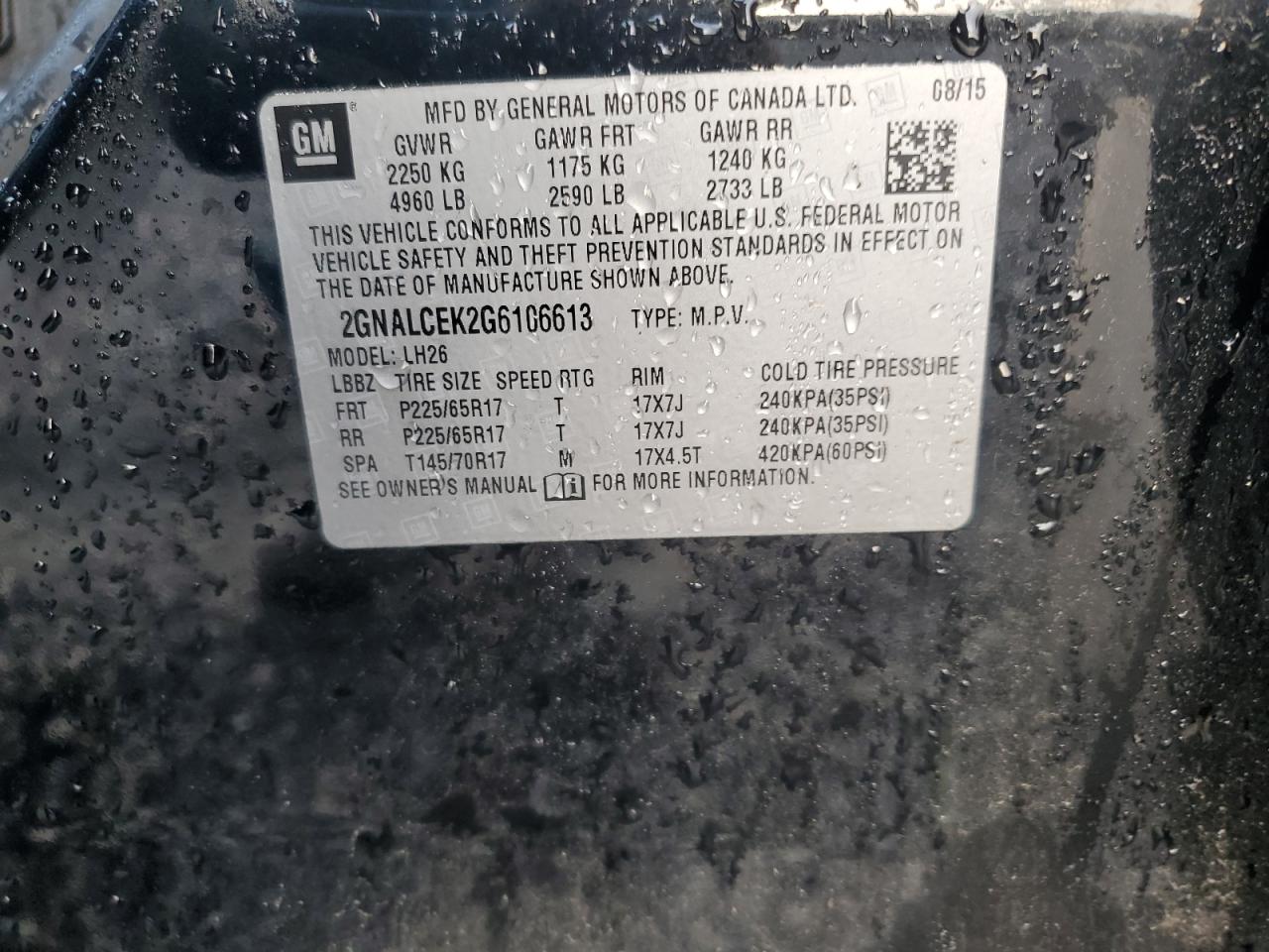 CHEVROLET EQUINOX 2.4 2016 г.в., (2GNALCEK2G6106613) из США
