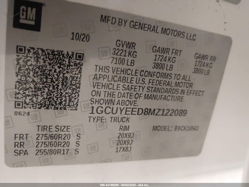 Цвет БелыйЦилиндры 8Привод Полный приводVIN 1GCUYEED8MZ122089Состояние СтационарноПовреждение Передняя и задняяДата аукциона 2025-11-04