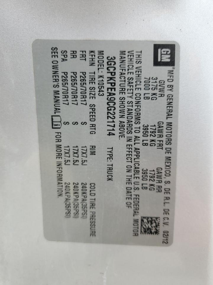 Цвет СеребряныйЦилиндры 8Привод 4x4 с задним приводомVIN 3GCPKPEA9CG221714Состояние НеизвестноПовреждение Передняя или задняя