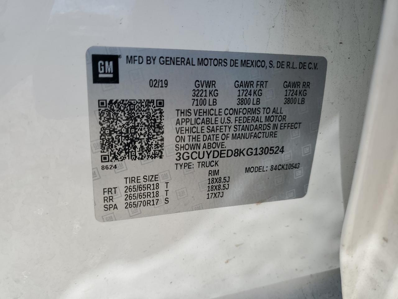 Цвет БелыйЦилиндры 8Привод 4x4 с задним приводомVIN 3GCUYDED8KG130524Состояние НеизвестноПовреждение Передняя или задняя