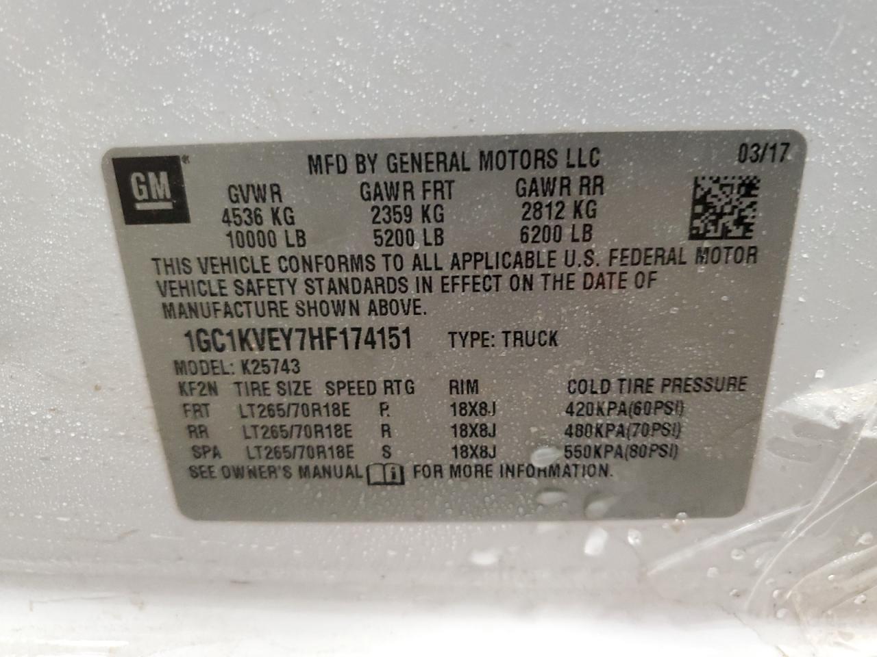 Цвет БелыйЦилиндры 8Привод 4x4 с задним приводомVIN 1GC1KVEY7HF174151Состояние Заводится и едет (проверено)Повреждение Передняя или задняя
