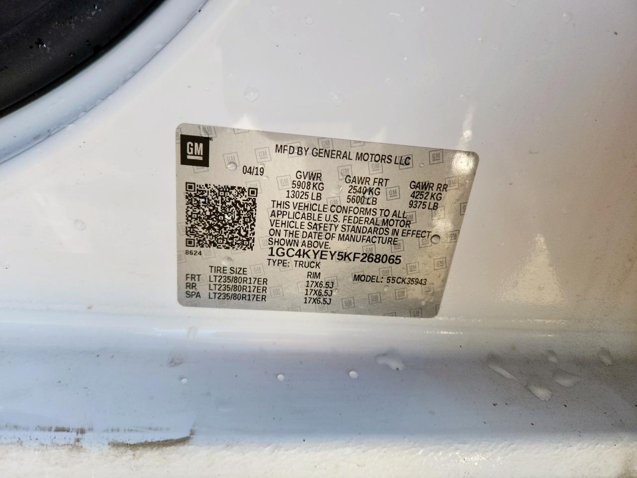 Цвет БелыйЦилиндры 8Привод 4x4 с задним приводомVIN 1GC4KYEY5KF268065Состояние НеизвестноПовреждение Передняя или задняя