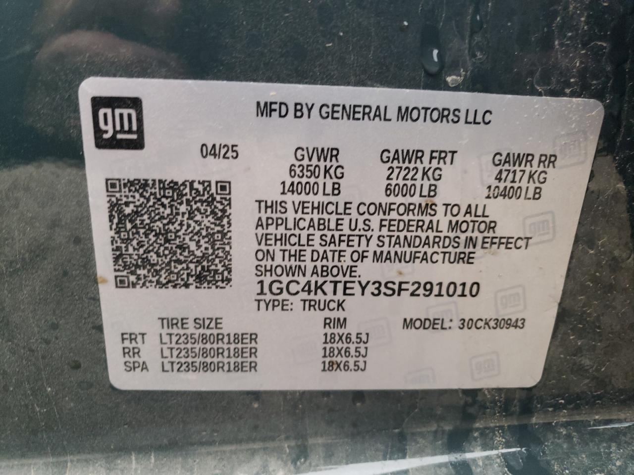 Цвет БирюзовийЦилиндры 8Привод 4x4 с задним приводомVIN 1GC4KTEY3SF291010Состояние ЗаводитсяПовреждение Передняя или задняяДата аукциона 2025-11-05