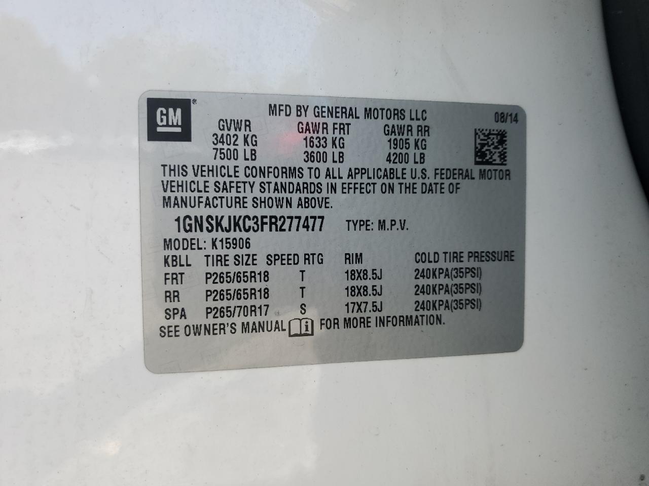 CHEVROLET SUBURBAN 5.3 2015 г.в., 4x4 с задним приводом (1GNSKJKC3FR277477) из США