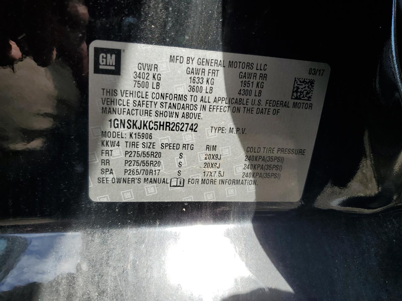 CHEVROLET SUBURBAN 5.3 2017 г.в., 4x4 с задним приводом (1GNSKJKC5HR262742) из США