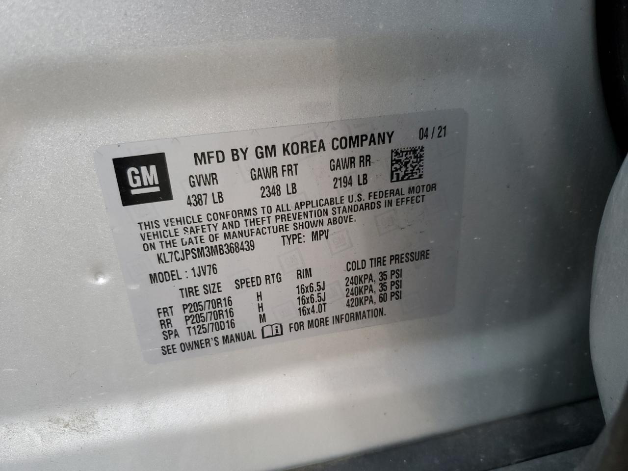 Цвет СеребряныйЦилиндры 4Привод Полный приводVIN KL7CJPSM3MB368439Состояние Заводится и едет (проверено)Повреждение ОпрокидываниеДата аукциона 2025-11-04