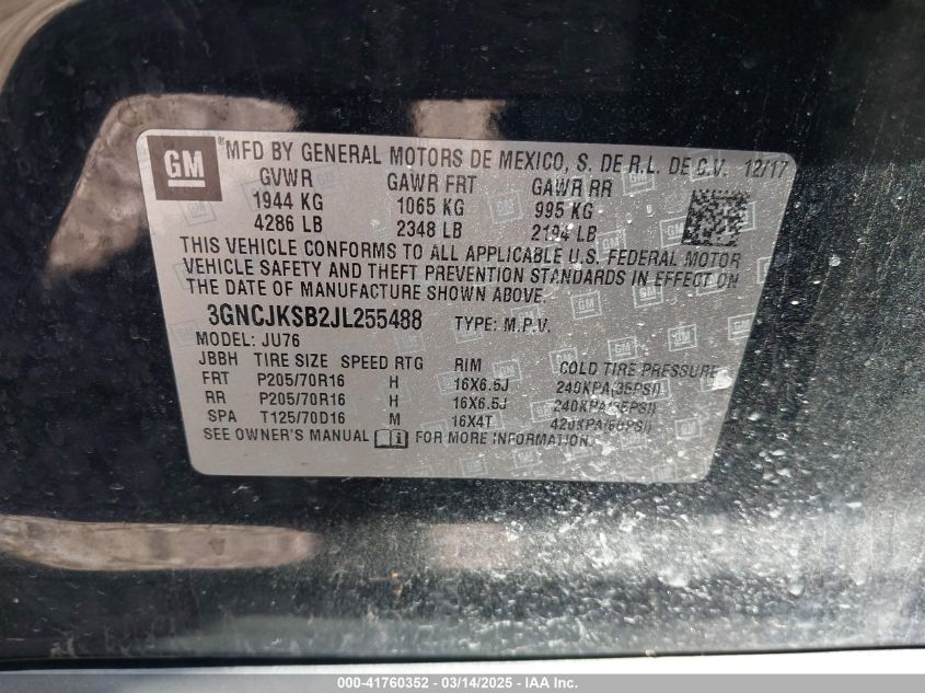 CHEVROLET TRAX 1.4 2018 г.в., Передний привод (3GNCJKSB2JL255488) из США