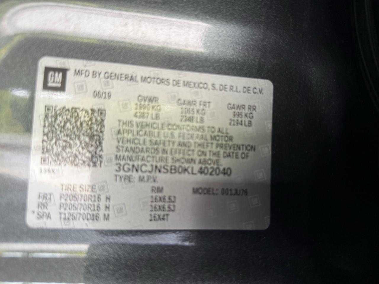 CHEVROLET TRAX 1.4 2019 г.в., Полный привод (3GNCJNSB0KL402040) из США