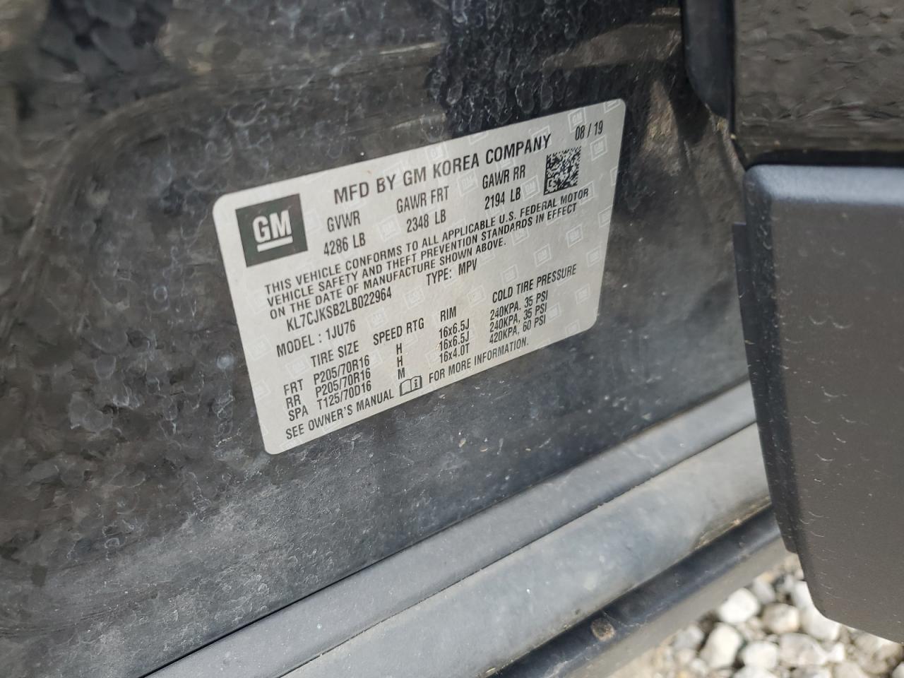 Цвет ЧерныйЦилиндры 4VIN KL7CJKSB2LB022964Состояние НеизвестноПовреждение Передняя или задняя