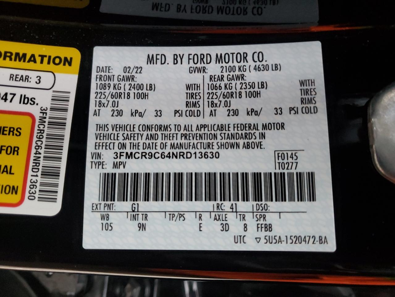 FORD BRONCO SPORT 1.5 2022 г.в., 4x4 с передним приводом (3FMCR9C64NRD13630) из США