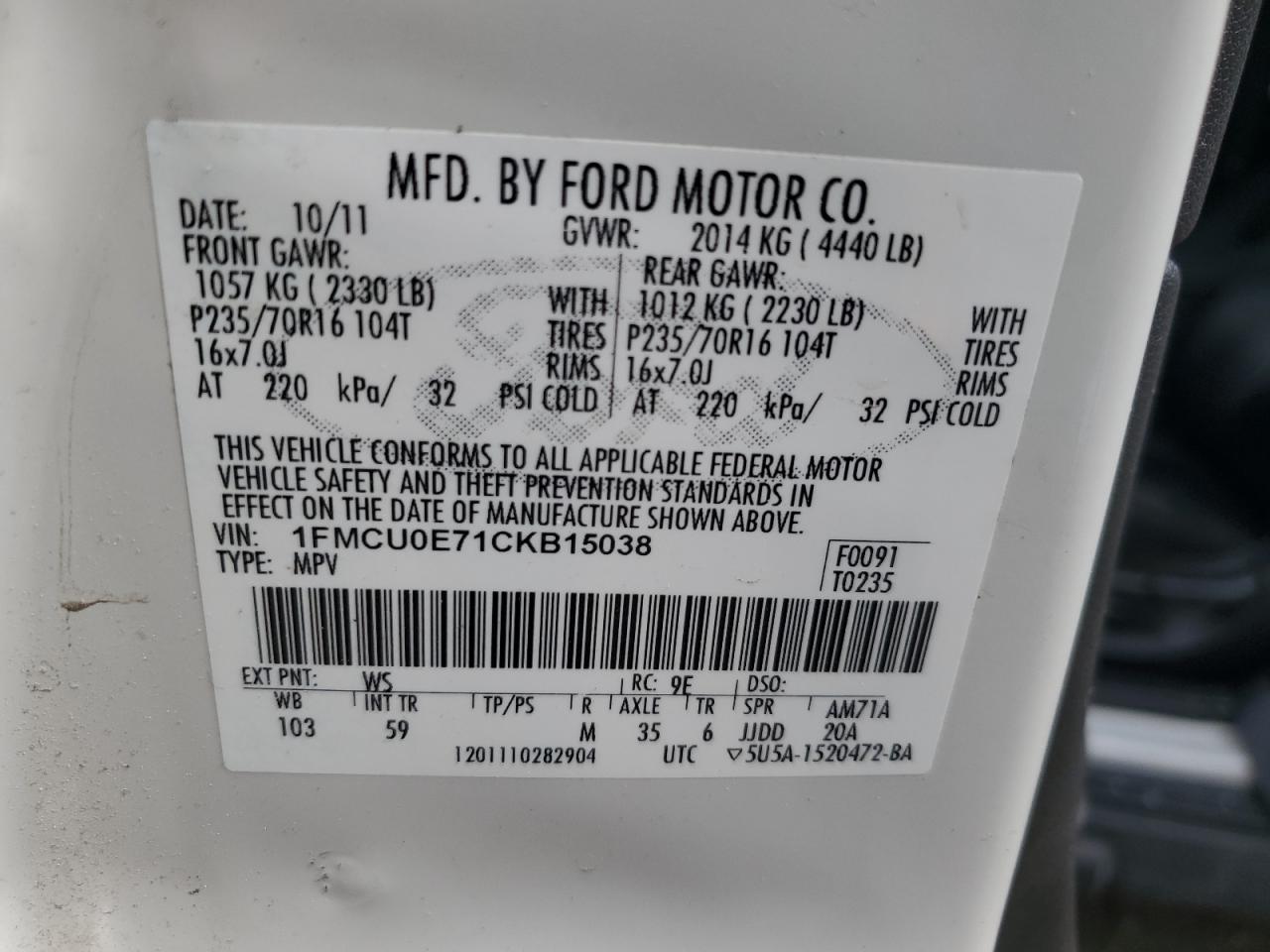 Цвет БелыйЦилиндры 4VIN 1FMCU0E71CKB15038Состояние Заводится и едет (проверено)Повреждение По бокам