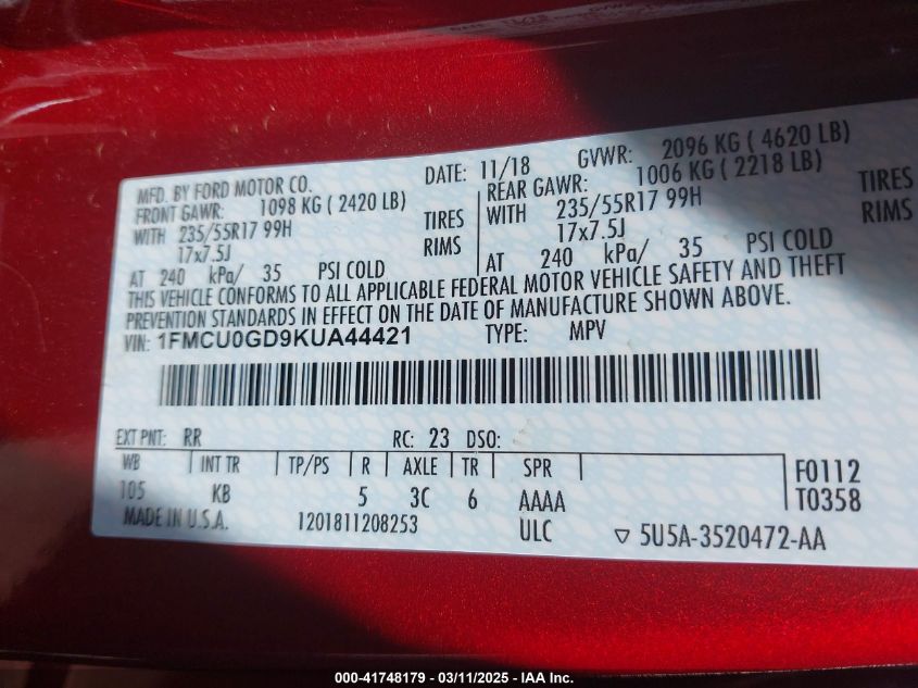 FORD ESCAPE 1.5 2019 г.в., Передний привод (1FMCU0GD9KUA44421) из США