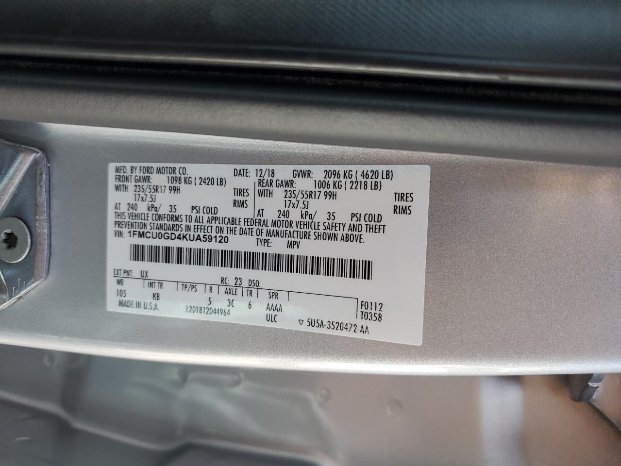 Цвет СеребряныйЦилиндры 4VIN 1FMCU0GD4KUA59120Состояние Заводится и едет (проверено)Повреждение Передняя или задняяДата аукциона 2025-11-05