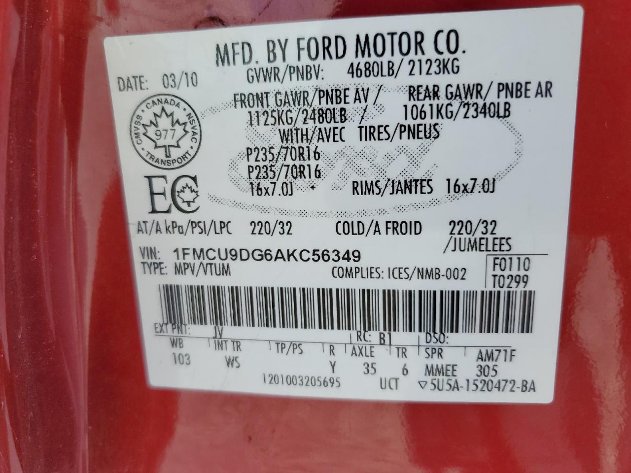 FORD ESCAPE 3.0 2010 г.в., Полный привод (1FMCU9DG6AKC56349) из США
