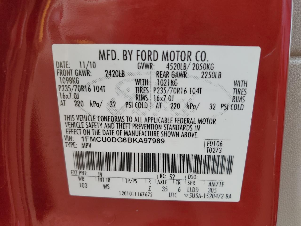 Цвет КрасныйЦилиндры 6VIN 1FMCU0DG6BKA97989Состояние Заводится и едет (проверено)Повреждение Передняя или задняя