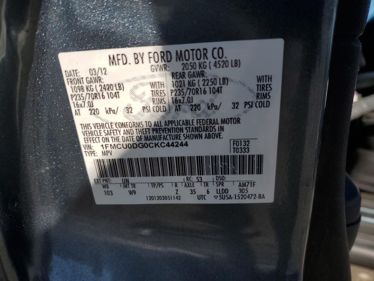 Цвет БирюзовийЦилиндры 6VIN 1FMCU0DG0CKC44244Состояние НеизвестноПовреждение Задняя