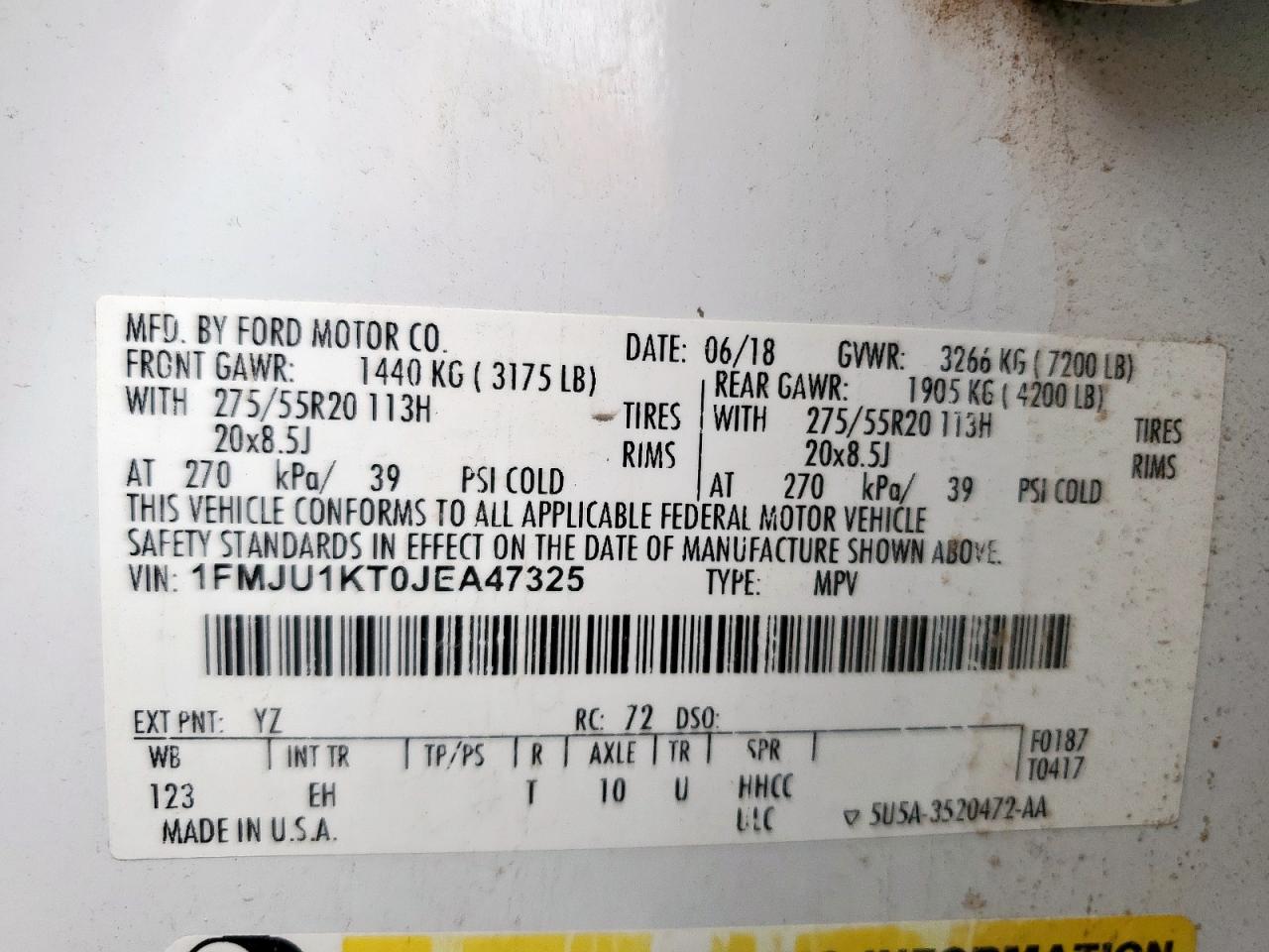Цвет БелыйЦилиндры 6Привод Задний приводVIN 1FMJU1KT0JEA47325Состояние НеизвестноПовреждение Вандализм