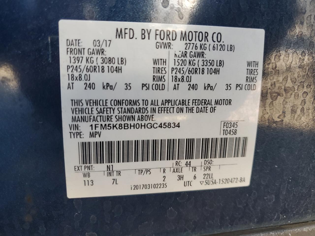 FORD EXPLORER 2.3 2017 г.в., 4x4 с передним приводом (1FM5K8BH0HGC45834) из США