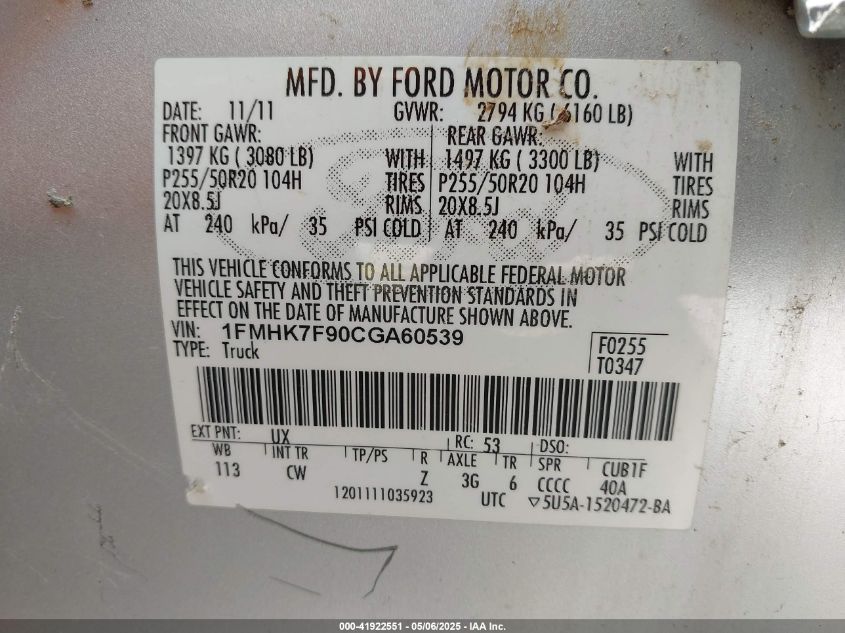 FORD EXPLORER 2.0 2012 г.в., Передний привод (1FMHK7F90CGA60539) из США