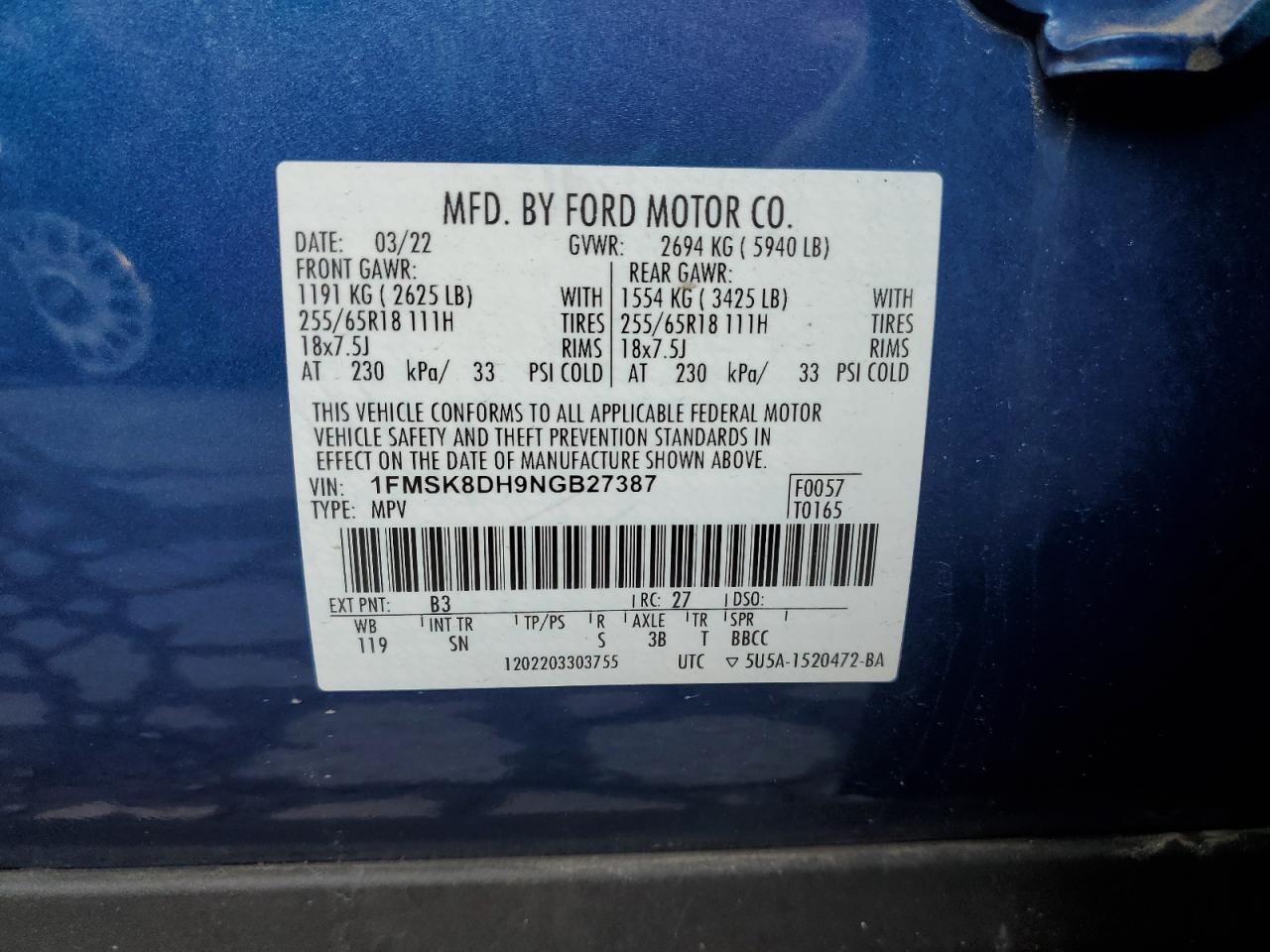 Цвет СинийЦилиндры 4Привод 4x4 с задним приводомVIN 1FMSK8DH9NGB27387Состояние НеизвестноПовреждение Передняя или задняяДата аукциона 2025-11-14