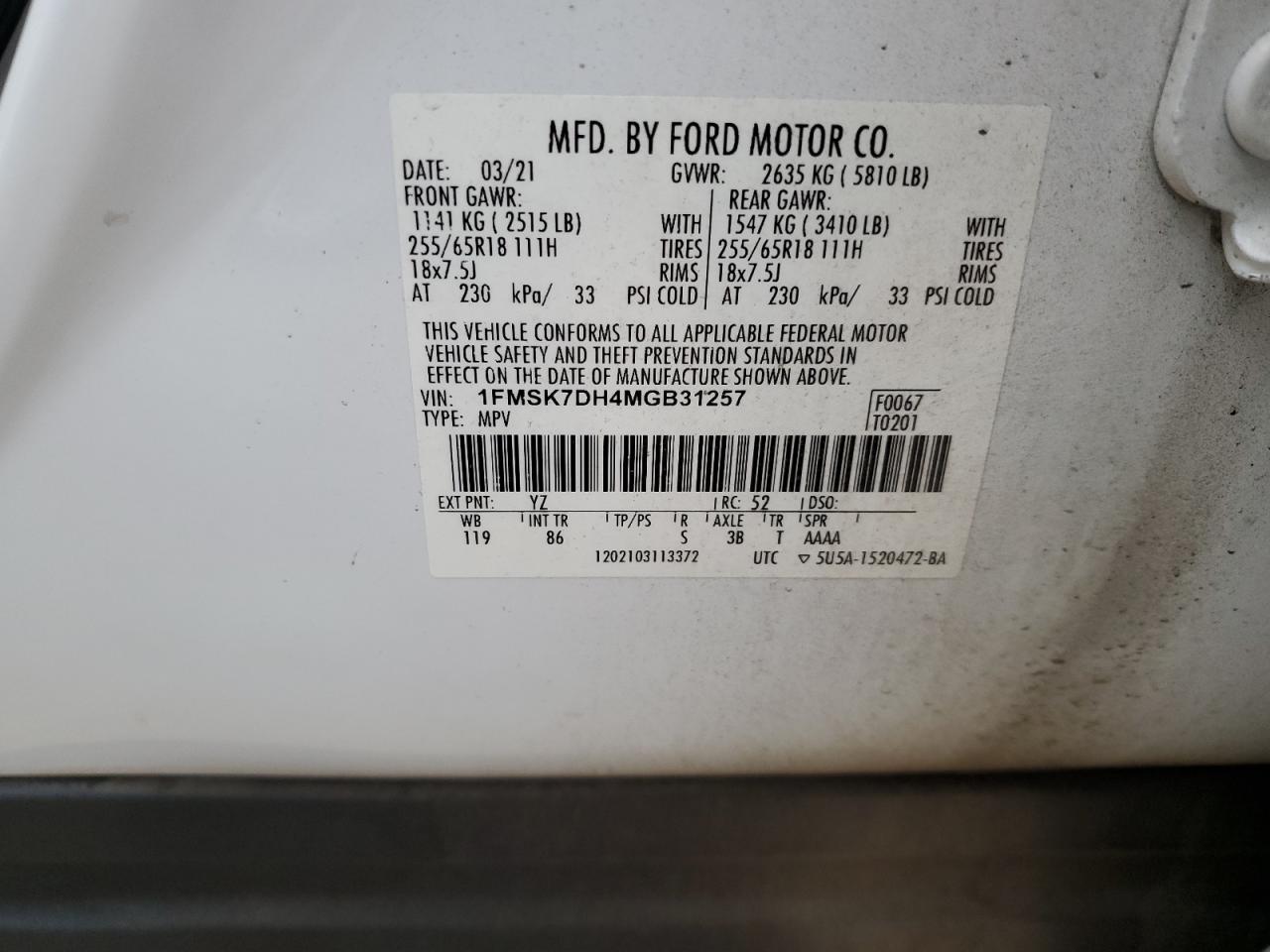 Цвет БелыйЦилиндры 4Привод Задний приводVIN 1FMSK7DH4MGB31257Состояние Заводится и едет (проверено)Повреждение Передняя или задняя