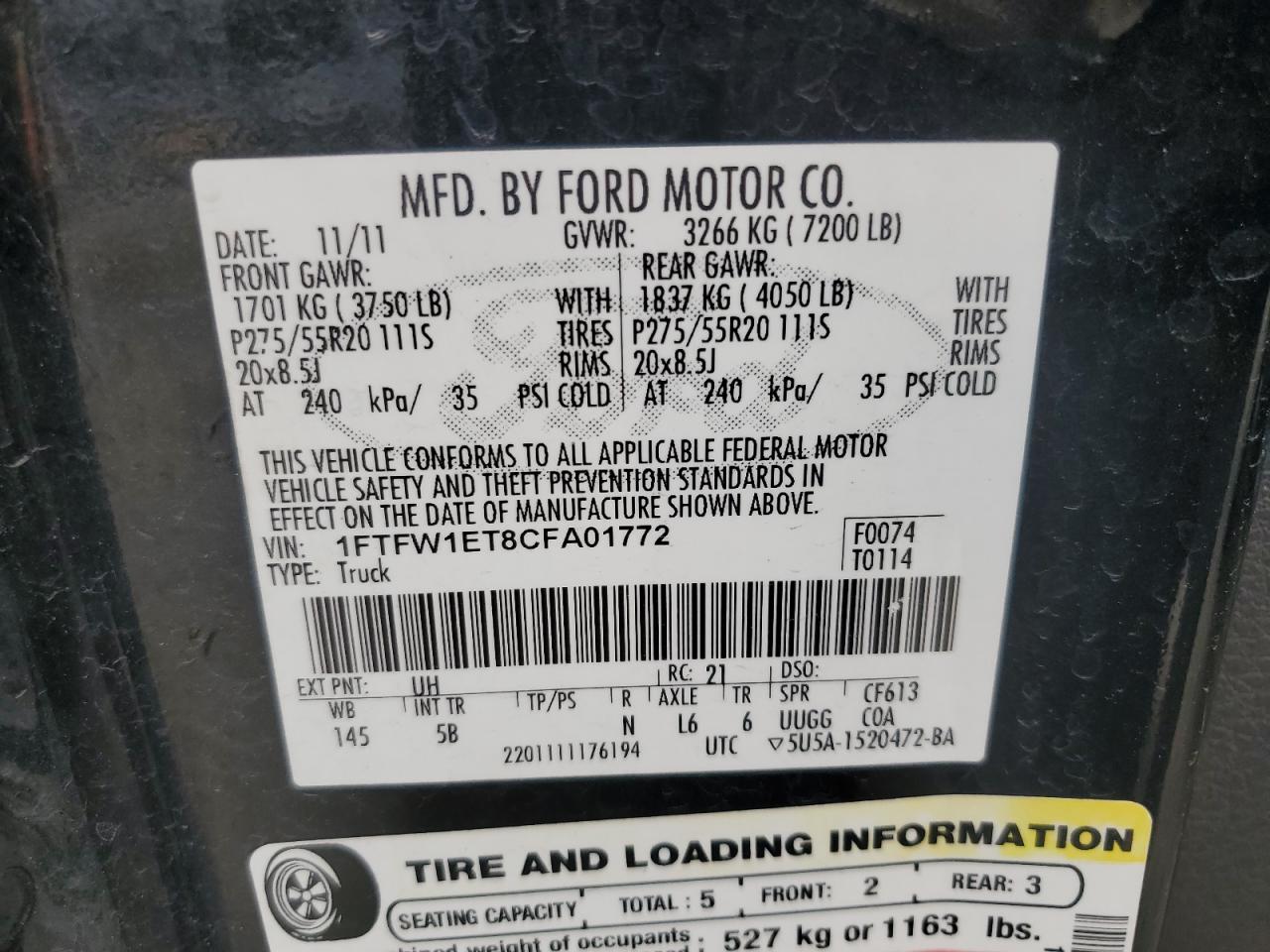 FORD F-150 3.5 2012 г.в., 4x4 с задним приводом (1FTFW1ET8CFA01772) из США