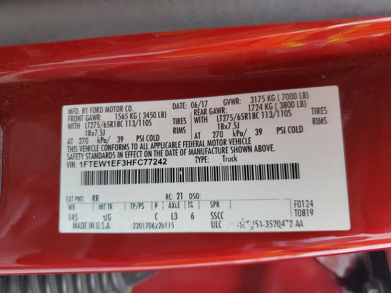 Цвет КрасныйЦилиндры 8Привод 4x4 с задним приводомVIN 1FTEW1EF3HFC77242Состояние Заводится и едет (проверено)Повреждение По бокамДата аукциона 2025-11-10