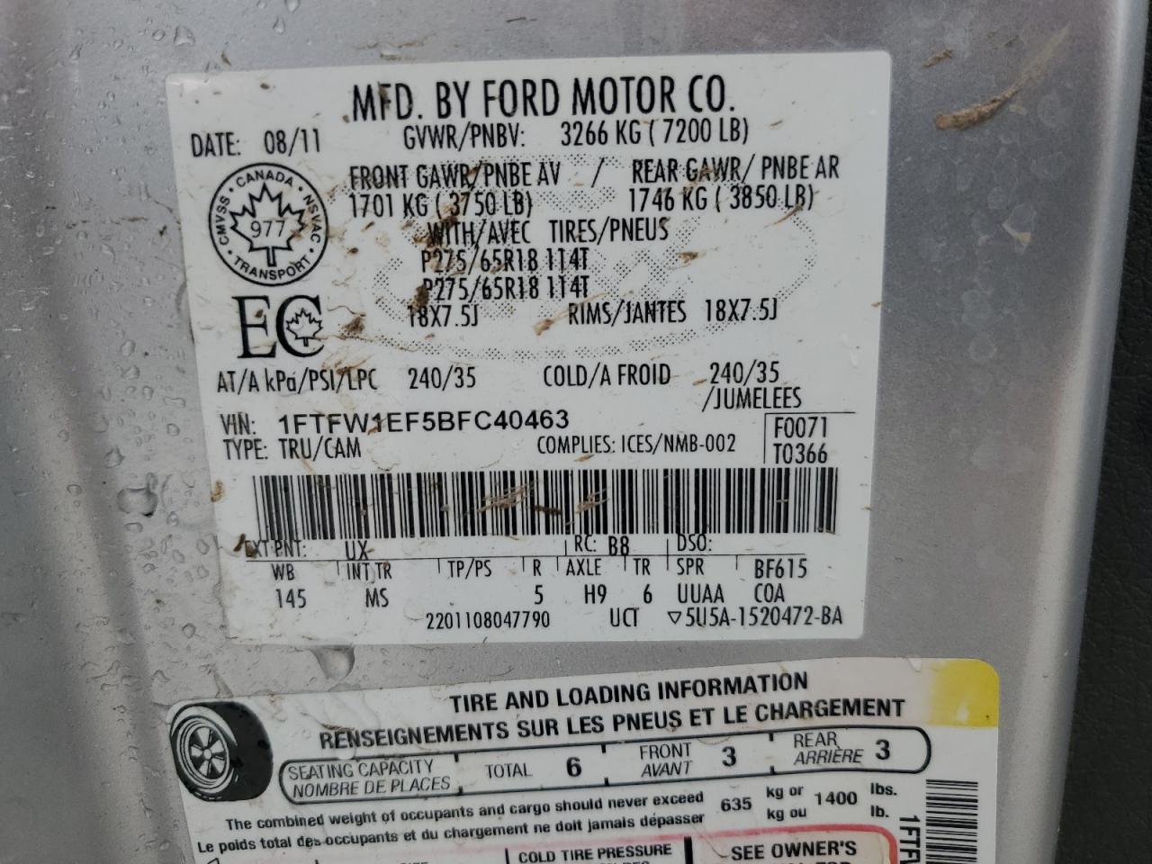 FORD F-150 5.0 2011 г.в., 4x4 с задним приводом (1FTFW1EF5BFC40463) из США