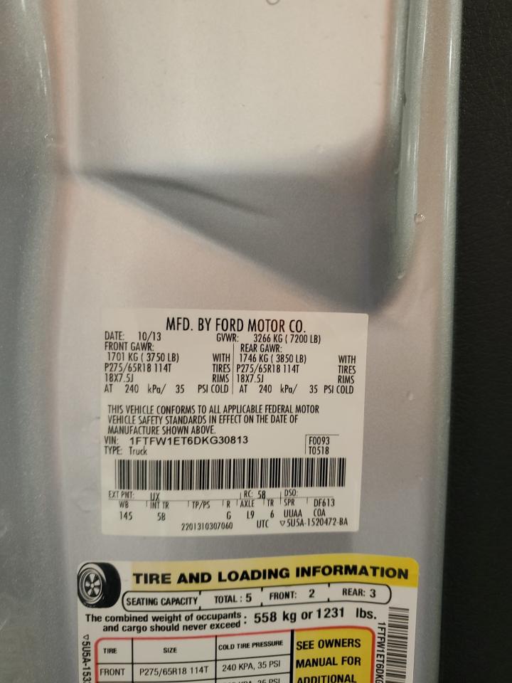 Цвет СеребряныйЦилиндры 6Привод 4x4 с задним приводомVIN 1FTFW1ET6DKG30813Состояние Заводится и едет (проверено)Повреждение Передняя или задняя