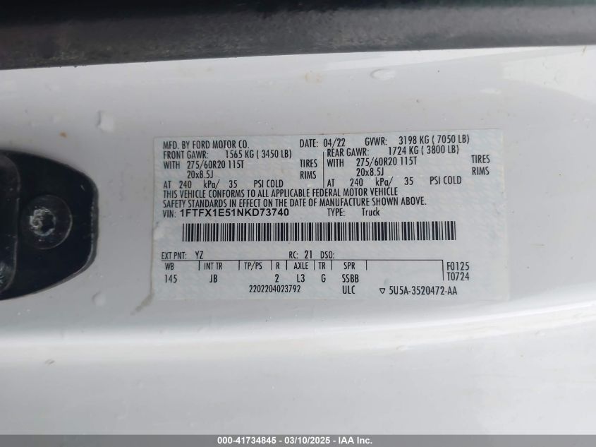 FORD F-150 5.0 2022 г.в., Полный привод (1FTFX1E51NKD73740) из США