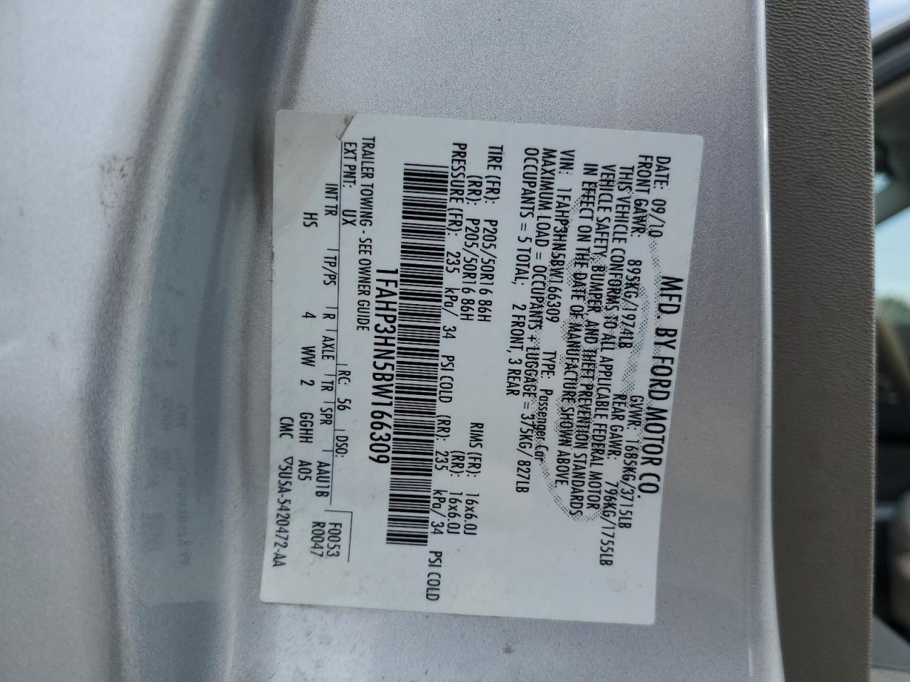 Цвет СеребряныйЦилиндры 4VIN 1FAHP3HN5BW166309Состояние Заводится и едет (проверено)Повреждение Передняя или задняя