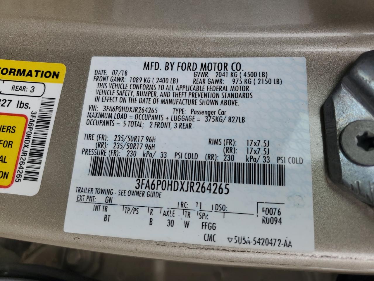Цвет ЗолотойЦилиндры 4VIN 3FA6P0HDXJR264265Состояние НеизвестноПовреждение Передняя или задняяДата аукциона 2025-11-03