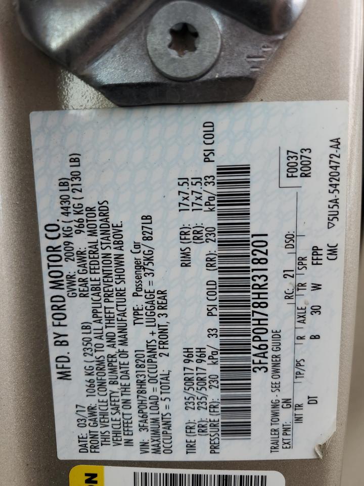 Цвет ЗолотойЦилиндры 4VIN 3FA6P0H78HR318201Состояние ЗаводитсяПовреждение Передняя или задняяДата аукциона 2025-11-04