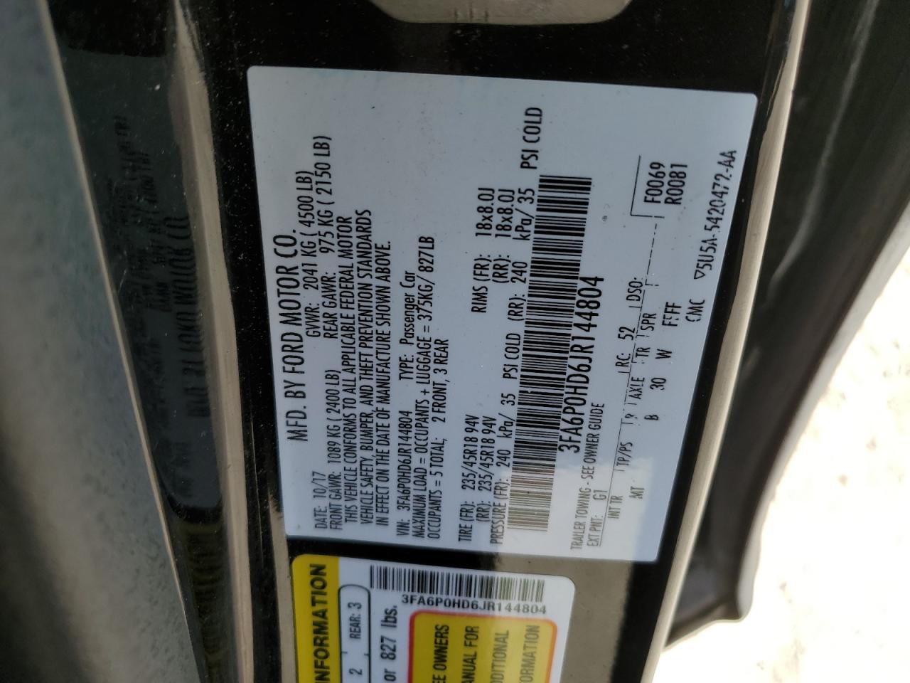 Цвет ЧерныйЦилиндры 4VIN 3FA6P0HD6JR144804Состояние Заводится и едет (проверено)Повреждение Передняя или задняя