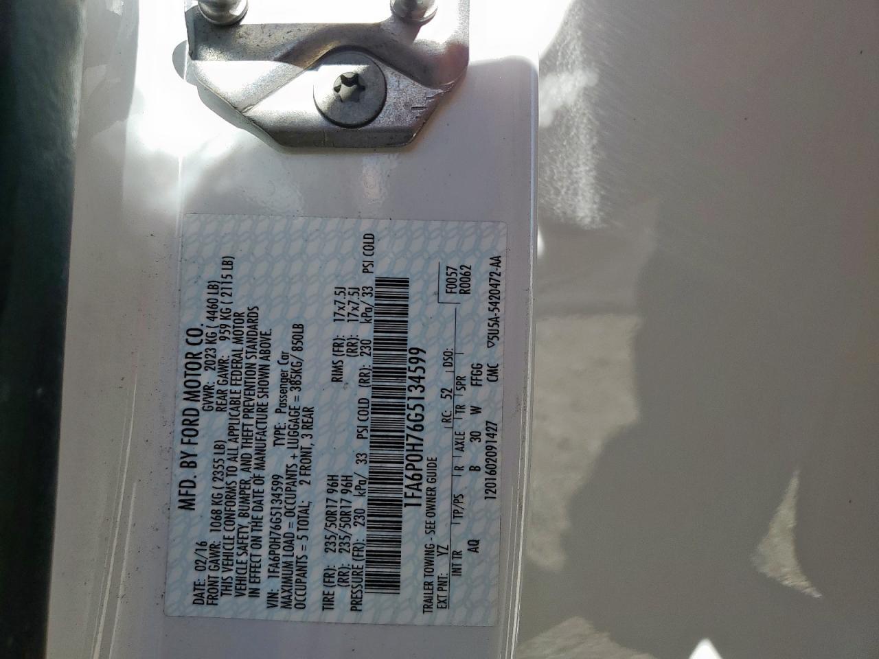 Цвет БелыйЦилиндры 4VIN 1FA6P0H76G5134599Состояние Заводится и едет (проверено)Повреждение Задняя