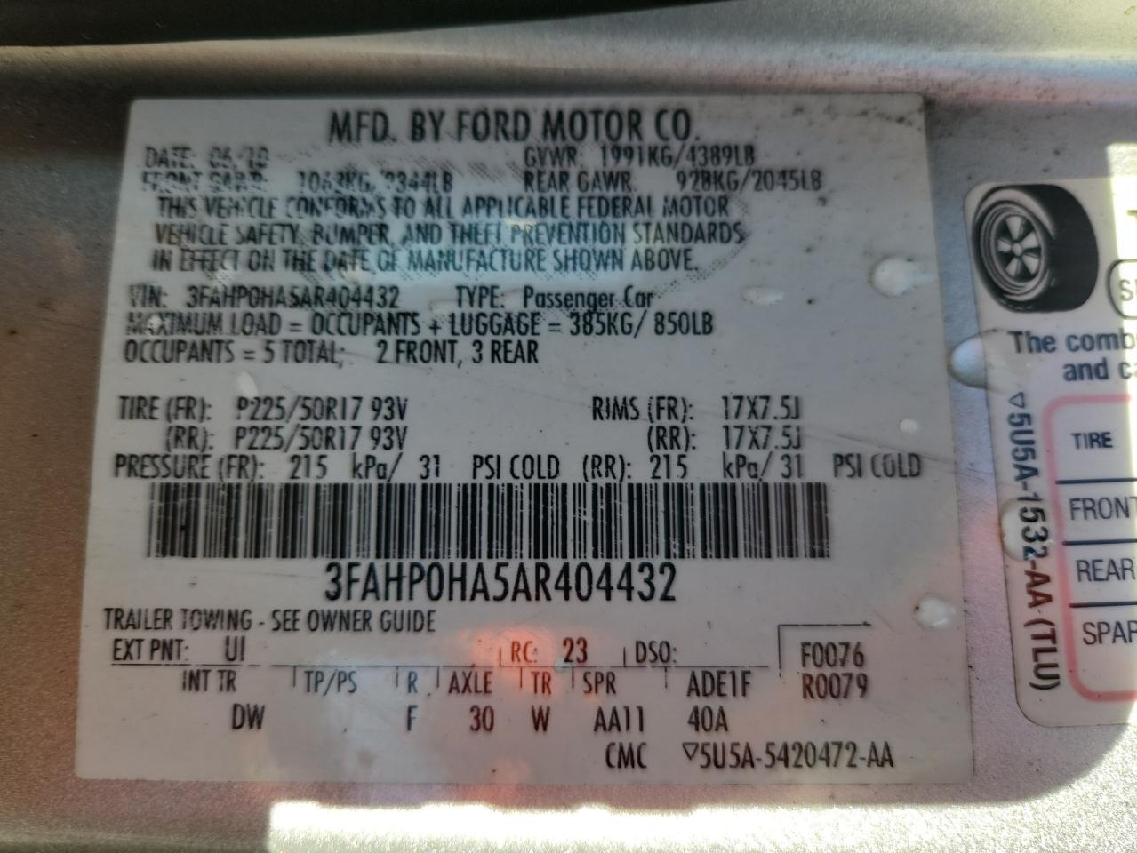 FORD FUSION 2.5 2010 г.в., (3FAHP0HA5AR404432) из США