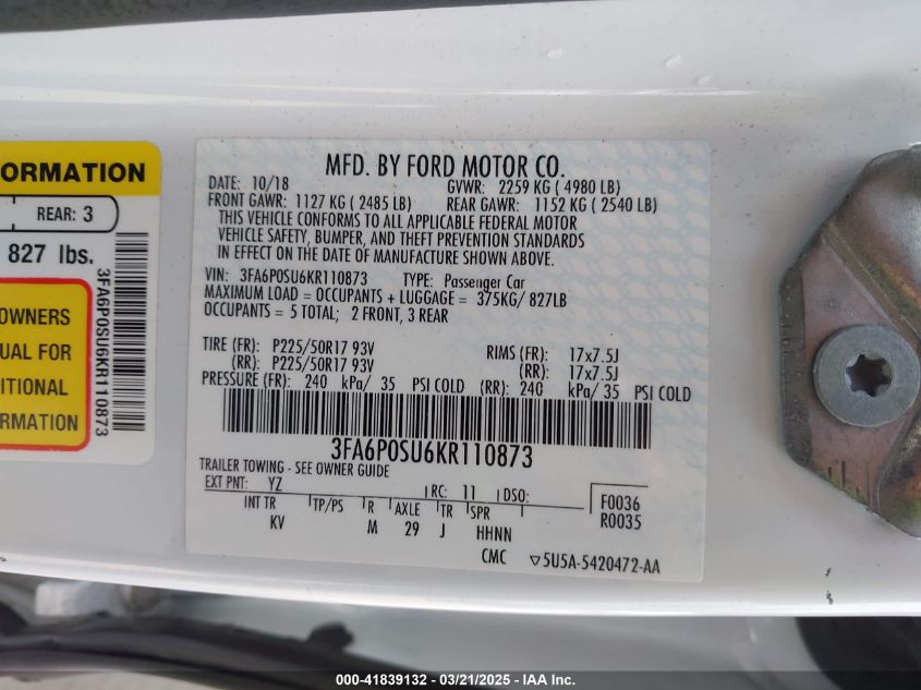 FORD FUSION 2.0 2019 г.в., Передний привод (3FA6P0SU6KR110873) из США