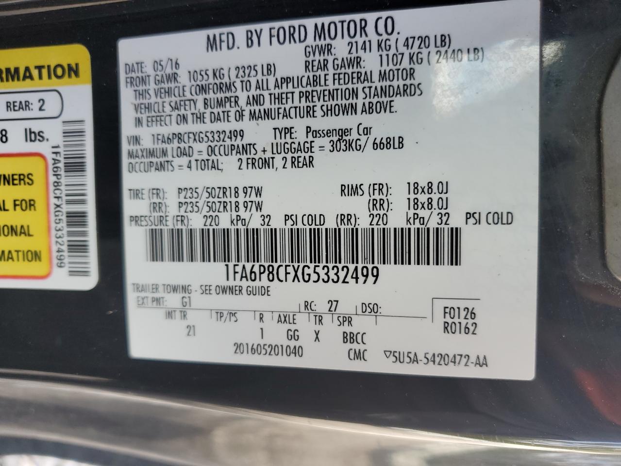 FORD MUSTANG 5.0 2016 г.в., Задний привод (1FA6P8CFXG5332499) из США