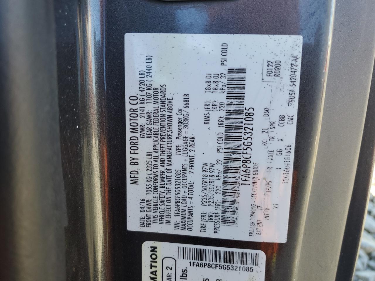 Цвет СерыйЦилиндры 8Привод Задний приводVIN 1FA6P8CF5G5321085Состояние Заводится и едет (проверено)Повреждение Задняя