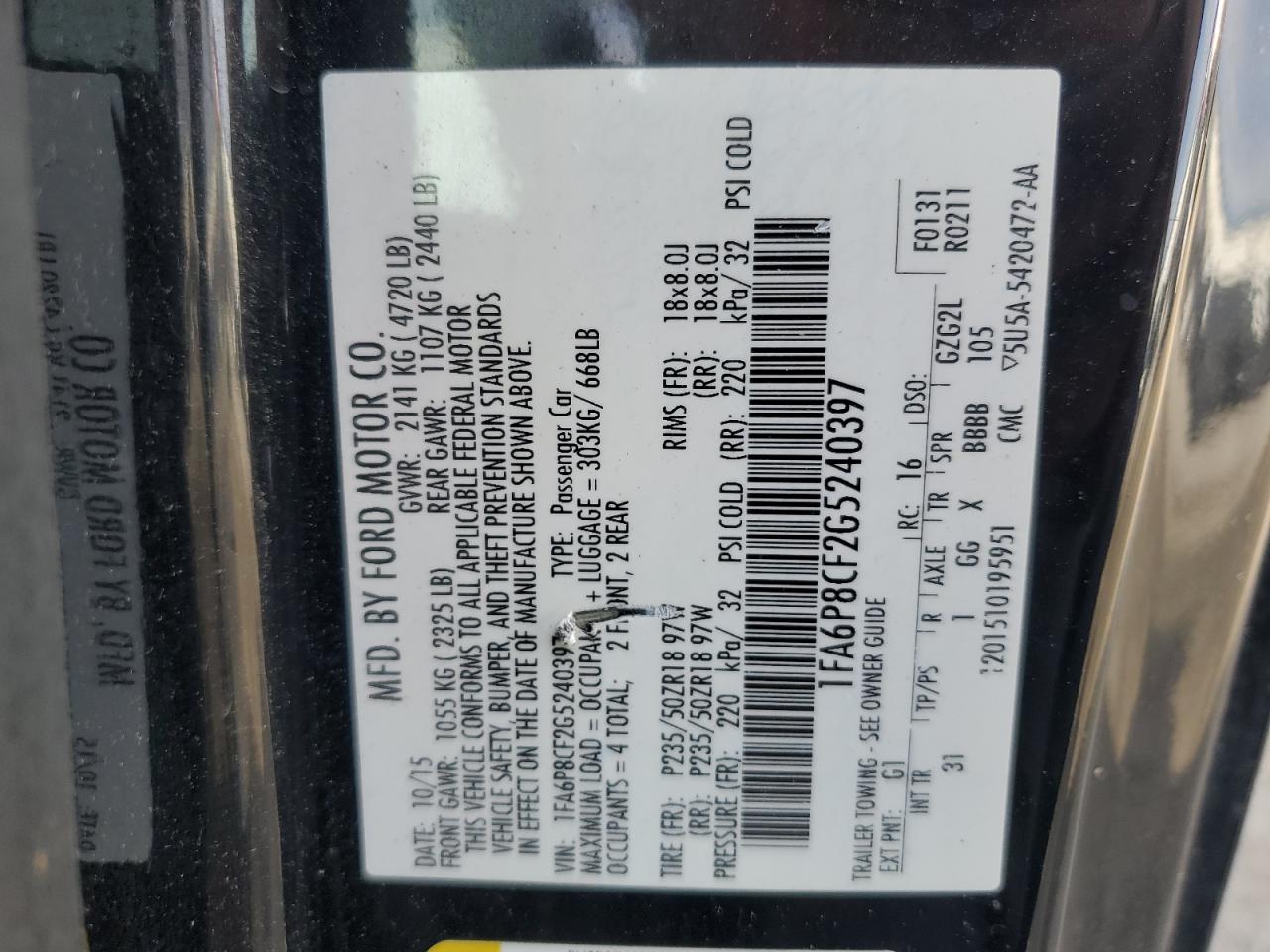 Цвет ЧерныйЦилиндры 8Привод Задний приводVIN 1FA6P8CF2G5240397Состояние НеизвестноПовреждение Передняя или задняя