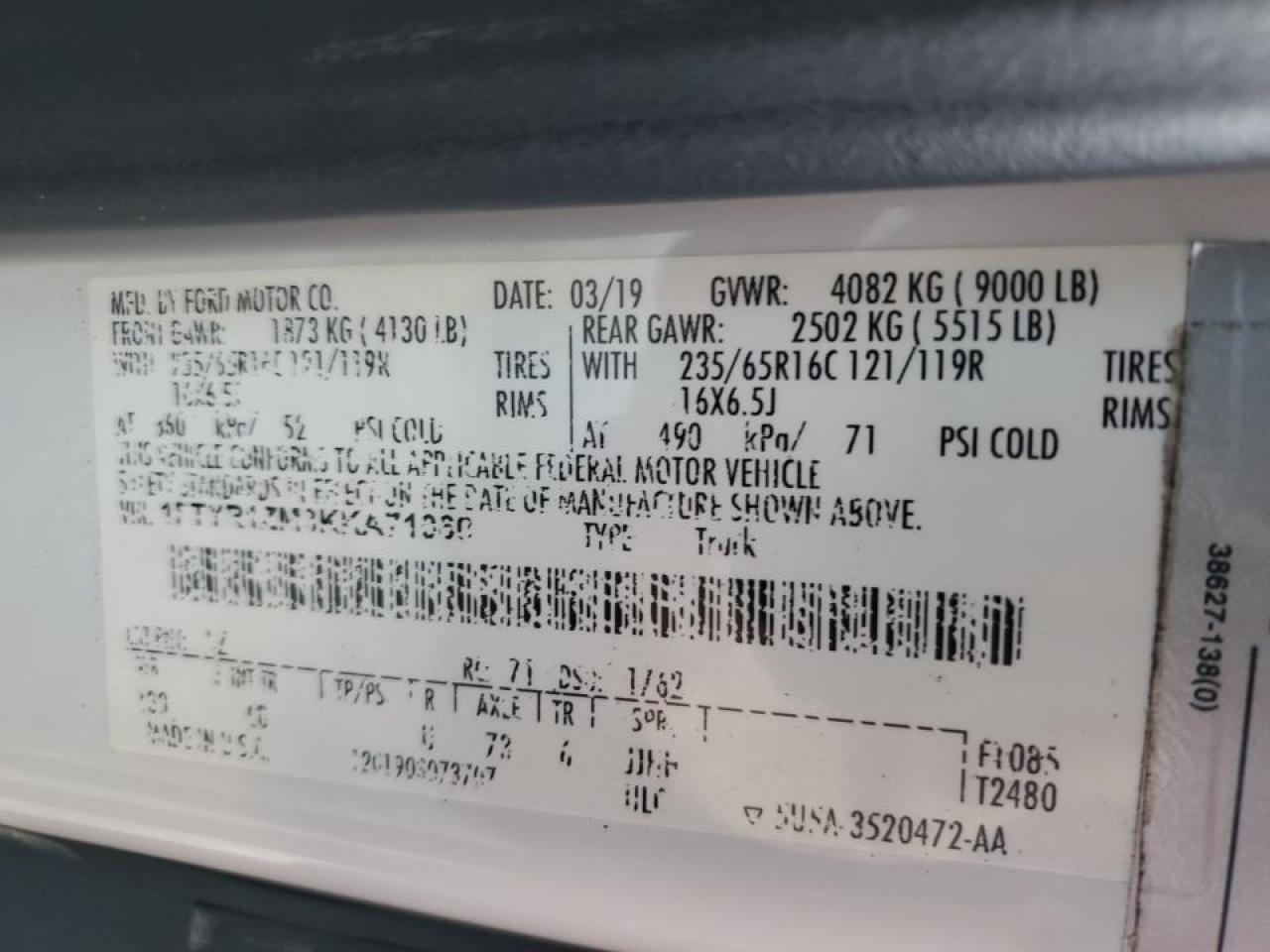 FORD TRANSIT 3.7 2019 г.в., Задний привод (1FTYR1ZM3KKA71060) из США