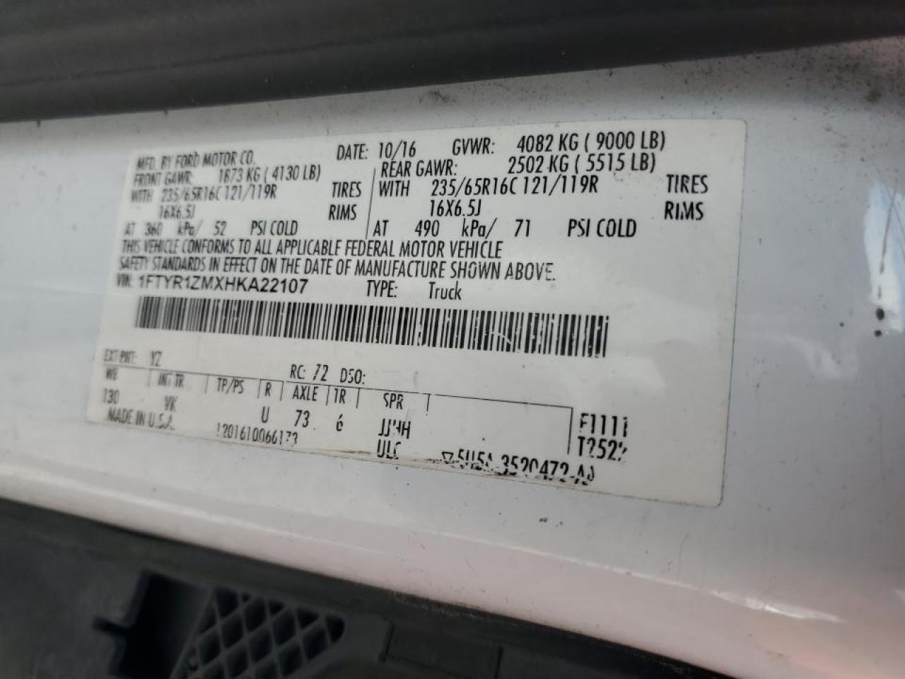 FORD TRANSIT 3.7 2017 г.в., Задний привод (1FTYR1ZMXHKA22107) из США