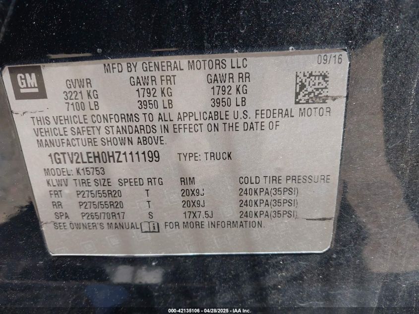GMC SIERRA 1500 4.3 2017 г.в., Полный привод (1GTV2LEH0HZ111199) из США